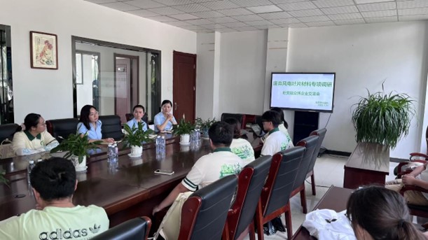 首先,團(tuán)隊(duì)成員與眾博公司風(fēng)電事業(yè)部、技術(shù)部的何經(jīng)理和魏經(jīng)理展開(kāi)了交流討論,就目前風(fēng)電葉片復(fù)合材料使用情況、材料體系、廢棄后處理方法、市場(chǎng)規(guī)模等進(jìn)行了深入探討。