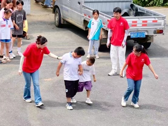 每支隊伍都開啟了速度和體力的競技,別看孩子們個子小,比起賽來個個熱情高漲、生龍活虎。在“兩人三足”團體賽中,隊員們肩靠肩,手握手,齊喊著“左右左 ,左右左”,口號聲助力聲將緊張的氣氛推向高潮……支教老師們也全身心投入、全方位配合,加油聲、吶喊聲、歡呼聲,溢滿整個操場。