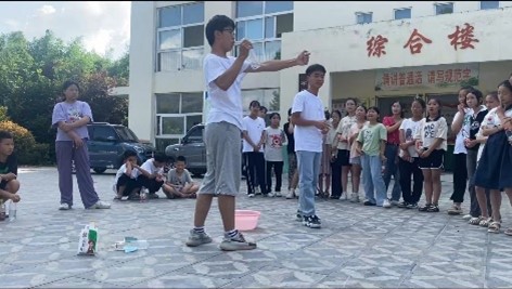 搭橋實驗結束后,老師們又帶領同學們進行了一節生動有趣的化學實驗課。課堂上老師首先講解了將要進行的化學實驗的相關原理,接著在教室內外分別演示了有趣的化學實驗。