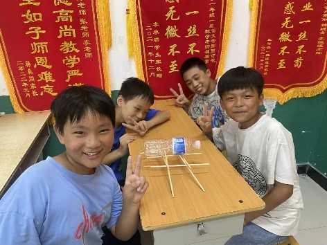 在教室外,我們首先做了酒精燃燒實驗,并在實驗結束后強調酒精易燃,在使用、存放時酒精要注意安全問題。我們還做了“火箭”飛天實驗,利用白醋與小蘇打在提前制作好的“火箭”中反應產生壓強差,最終使“火箭”成功飛天。