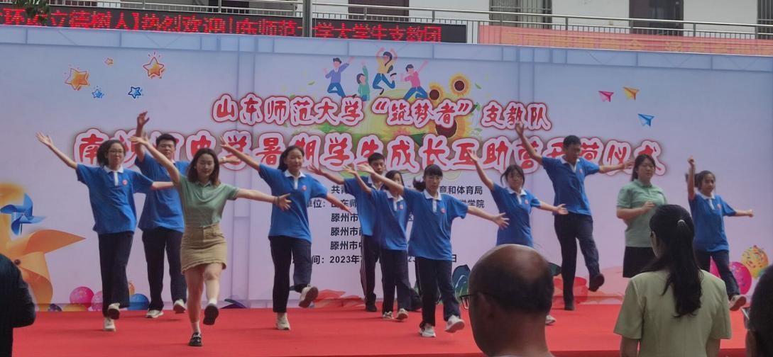 伴隨著活力四射的開場(chǎng)舞《開心往前飛》開營(yíng)儀式拉開了帷幕。首先,南沙河中學(xué)校長(zhǎng)王桂桐就本次支教活動(dòng)作了整體介紹;隨后,志愿者們上臺(tái)與師生見面,李筱文隊(duì)長(zhǎng)介紹了支教活動(dòng)的意義和活動(dòng)方式,學(xué)生代表狄璐表達(dá)了對(duì)各項(xiàng)課程的期待和學(xué)好課程的決心;最后,市教體局思政科副科長(zhǎng)張霞和副鎮(zhèn)長(zhǎng)滿蘇寧分別致辭,表示將全力支持好支教活動(dòng)。團(tuán)市委王海洋主任宣布成長(zhǎng)互助營(yíng)開營(yíng)。開營(yíng)儀式在大合唱《我的未來不是夢(mèng)》勵(lì)志的歌聲中落下帷幕。