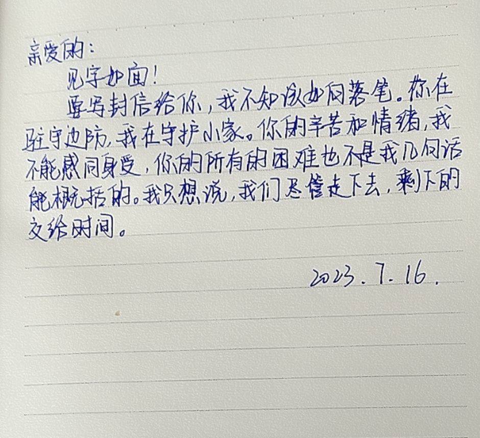 在與軍嫂進(jìn)行深入交流之后,鼓勵(lì)軍嫂將對(duì)思念濃縮進(jìn)信中以表寄托,在寫信過程中,軍嫂給志愿者留下印象最深的一句話是這樣的:“當(dāng)祖國和人民需要的時(shí)候,我愿和他并肩前行,做他的無名戰(zhàn)友。”正是有這樣一群可愛的人,軍人才能有力地為國家效力。書信完成后,志愿者向軍嫂保證會(huì)講她們的心意傳達(dá)給軍人,軍嫂也對(duì)志愿者表示感謝。