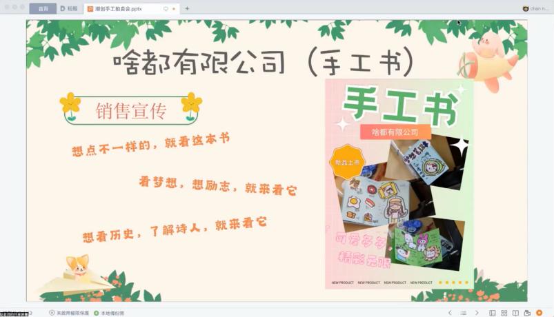 拍賣會上,同學們首先進行商品的展示與推銷。各組派出一名代表介紹商品,大家通過多樣的形式展現商品的特色,吸引買家購買。有的同學通過線上連線進行宣傳,有的則播放精心準備的介紹視頻。各組除了介紹商品的基本信息,還聲情并茂地講述了作品背后的故事,展示過程既有趣又令人記憶深刻。