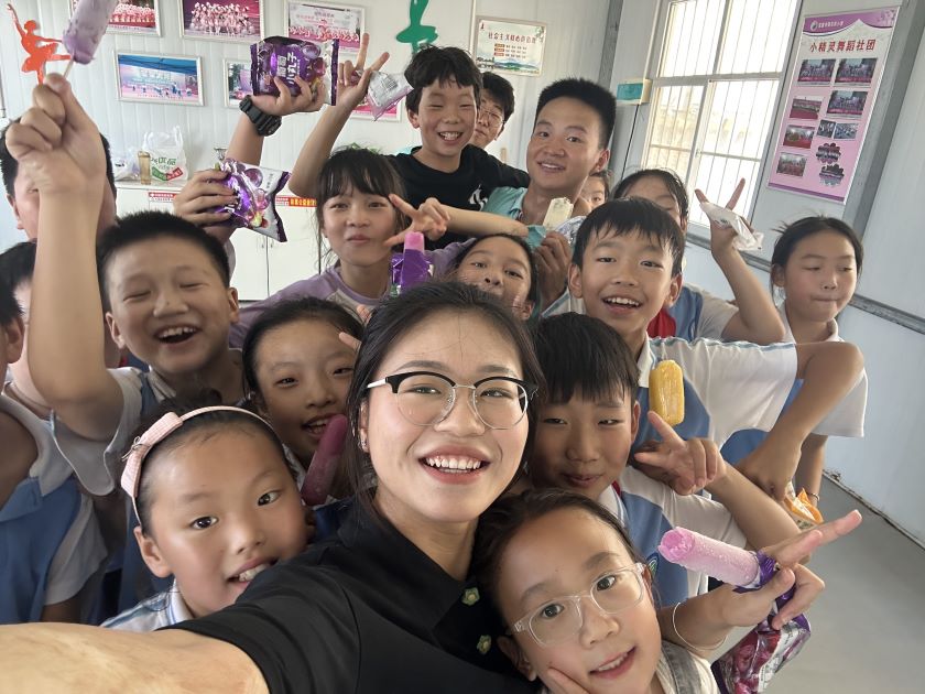 (圖為豫才支教隊在帶領學生們排練一天后的獎勵時刻)