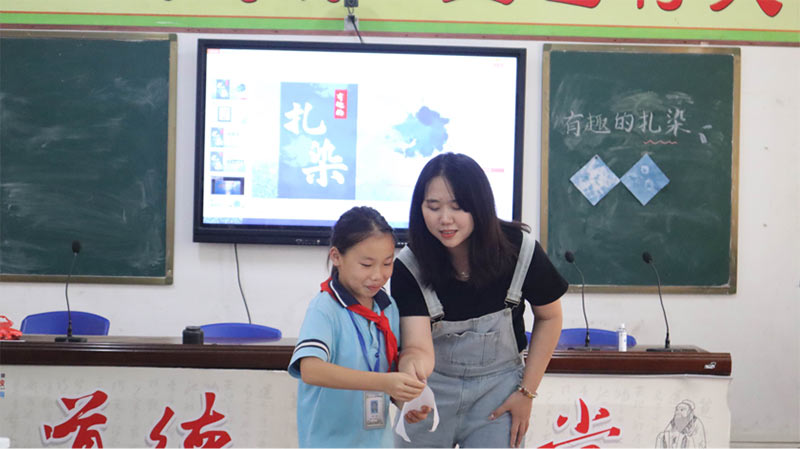 美育入童心,非遺進課堂 韻色豐富,變化自然,趣味無窮,即使千萬張,染出后也有不同的藝術效果,這就是扎染的韻味。為了進一步推進非物質文化遺產的曝光度和影響力,拉近與傳統工藝的距離,實踐隊隊員給孩子們帶來了一堂別開生面的扎染課,從扎染的含義、扎染的歷史發展、扎染的手法等角度入手,讓孩子們接觸扎染、了解扎染。