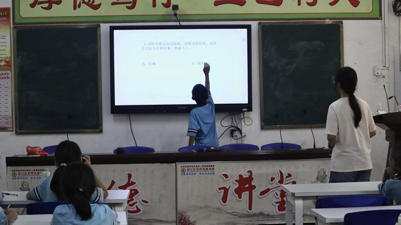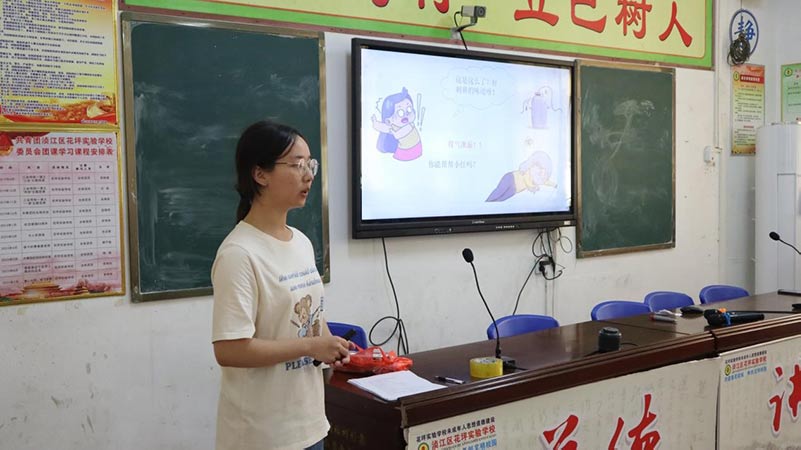 “如果我們的小伙伴不幸落水,對你發出求救,你該怎么做呢?”在預防溺水的教學上,實踐隊隊員從了解什么是溺水到如何自救以及發現他人溺水時如何施救開展防溺水教育,幫助學生系統學習、鞏固了預防溺水相關知識,了解了溺水的危害和預防措施,課中還將游戲與答題相結合,在緊張刺激的知識競賽中增加了課堂的趣味性,提高了學生參與課堂的積極性,在玩中學,在學中玩。