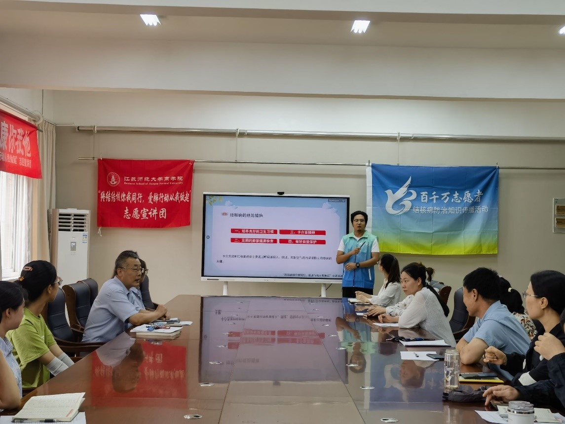 多彩大學生網徐州7月16日電(通訊員 王少逸、王葉、王藝潼)宣傳防治肺結核,健康生活你我他。7月15日下午,江蘇師范大學商學院結核防治志愿宣講團于商學院會議室面向商院青年教師開展了結核病知識宣講,力求切實有效地增強聽眾防病治病意識,為保障人民群眾身心健康安全做出積極貢獻。