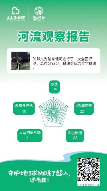 清掃活動結束后,團隊利用支付寶趣河邊軟件功能,開展了巡河監測活動。從水質狀況、水流狀況、河岸帶、生物多樣性、人與河流關系等5個維度,完成對黎家塘流溪河河流健康評測,準確、及時地反映水質現狀。