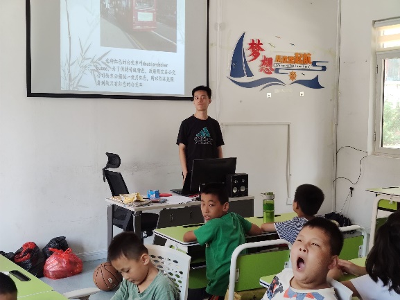 了解完地球的歷史,支教隊員董雨軒又用一堂“英國文化”課向同學(xué)們介紹了歐洲的人文風(fēng)情。他承接了曾一豪對地球的樣貌的介紹,首先帶同學(xué)們了解了英國在地球上的地理位置,又通過交通方式、飲食習(xí)慣、語言風(fēng)格、服裝特色以及傳統(tǒng)風(fēng)俗的對比,與同學(xué)們共同體會了中英兩國的文化差異。通過本節(jié)課,同學(xué)們了解到了世界文化的多元性,并培養(yǎng)了對于不同文化的包容性。