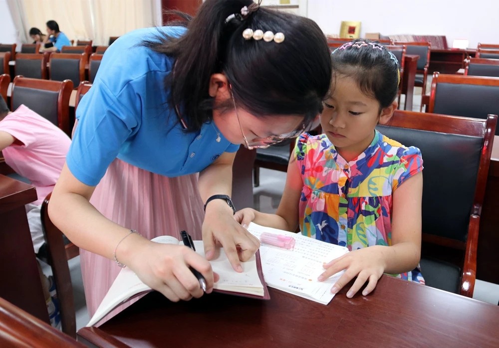 圖為實踐團成員一起輔導小朋友們做暑假作業。通訊員 李佳衡 供圖