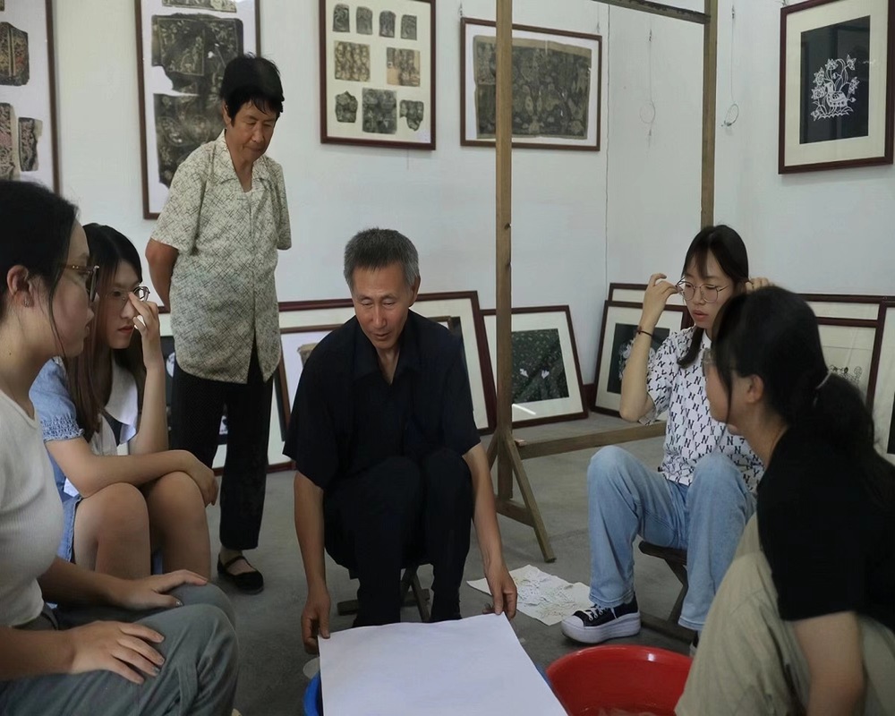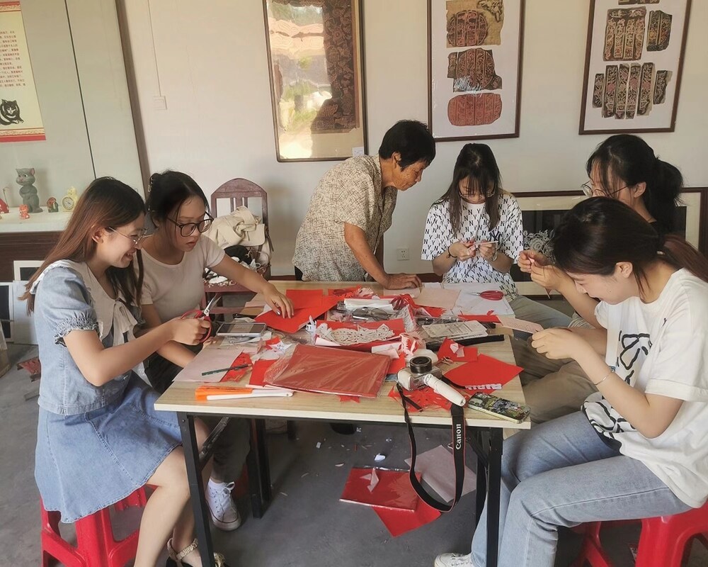 團(tuán)隊(duì)成員與劉玉秀老師共同學(xué)習(xí)剪紙(艾松林老師 攝)