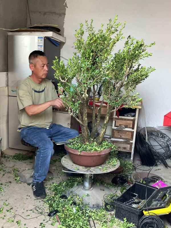 長成后,花農中的修剪師傅執剪除去黃葉壞葉雜葉頂葉,剪扎加工成“云片狀”,再以細絲纏繞樹枝,固定尺寸與形狀,往復修剪。待形成之日,除去細絲禁錮,再綴以山石,雅美如畫,具有極高的欣賞價值。