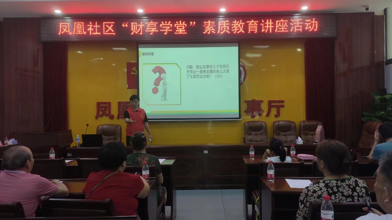 7月20日上午,“財享學堂”素質教育公益課堂在鳳凰社區居民委員會會議室正式啟動,面向鳳凰社區居民開展了為期兩天的培訓。本次公益課堂以“提高居民財經素養,謹防金融詐騙”為主題,從防詐與反詐、貨幣與利率、儲蓄與信貸、投資與收益這四個課題向社區居民進行財經知識科普。