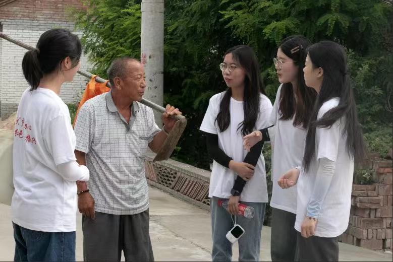 圖為實(shí)踐隊(duì)員同當(dāng)?shù)卮迕襁M(jìn)行交談