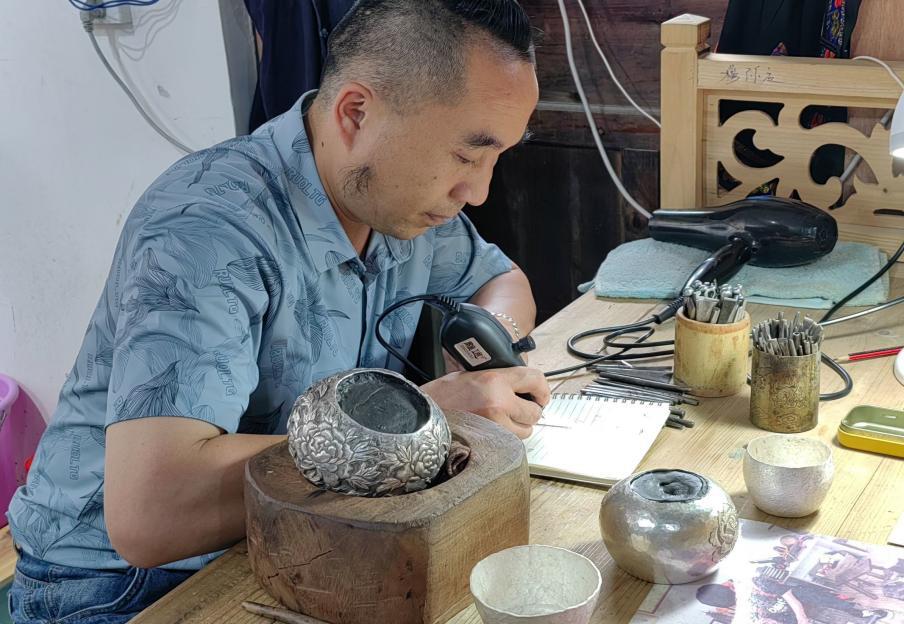 穆你應有些焦慮的表示,銀匠的主要收入來源是作為旅游文創售賣以及定制,但很多只能勉強能維持日常生活。銀飾作為苗族一種常見的飾品,代表著身體健康,每一件銀飾需要上千次的捶打,雕刻花紋又是獨一無二的,都是藝術孤品。雖然深受歡迎,但銀飾的制作工藝復雜,學習時間長達幾年,整個過程需要極大的耐心,而初學者的成品不夠精美難以取得客觀收入,不同程度導致銀飾文化傳承困難。