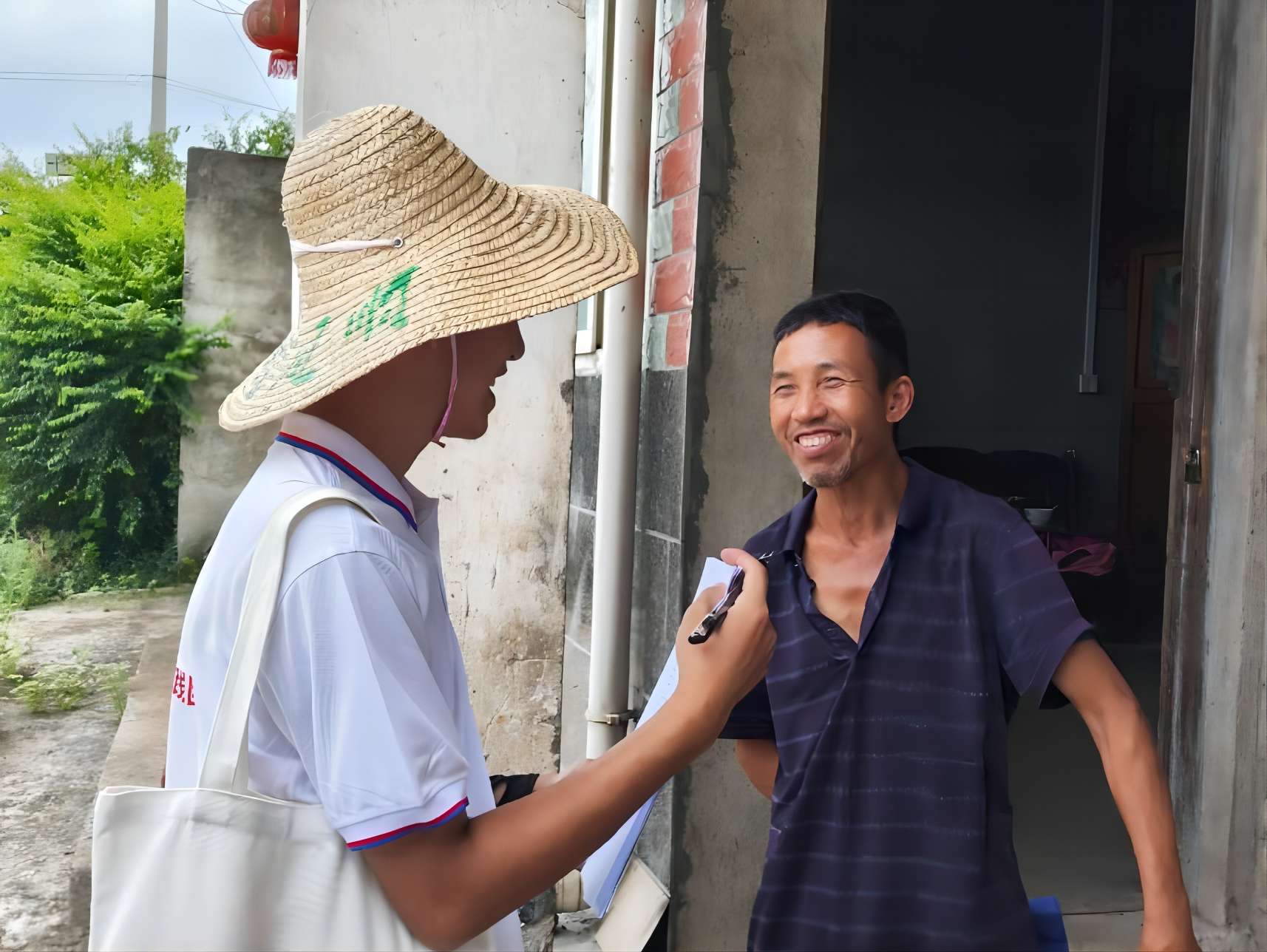 此圖為實踐團隊隊員在向村民進行問卷調(diào)研。