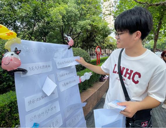 為結(jié)合地方生態(tài)環(huán)境特點,進一步推動生態(tài)文明建設(shè),將低碳環(huán)保的理論以及研究成果普及化,提高市民生態(tài)環(huán)保意識,實踐團經(jīng)分組前往多個市區(qū)廣場開展了人流調(diào)查工作,最后經(jīng)多方面討論確定以凱瑟琳廣場及其周邊地帶作為活動地點,于7月8日、7月9日開展了為期兩天的科普宣講活動。此次科普宣講,成員借助環(huán)保宣傳冊進行相關(guān)內(nèi)容的深度科普,倡導綠色出行、節(jié)約用電、進行垃圾分類等低碳環(huán)保的生活方式,將生態(tài)環(huán)保理念根植于市民心中。此外,實踐團成員還設(shè)立了生態(tài)環(huán)保互動展板,團隊成員向市民科普生態(tài)環(huán)保知識的同時,鼓勵市民積極參與互動,在展板上寫下自己的環(huán)保宣言。此次科普活動,對引導廣大市民牢固樹立綠色發(fā)展理念、踐行綠色低碳生產(chǎn)生活方式具有重大意義。實踐團將基于此次社會實踐成果,進一步宣傳生態(tài)環(huán)境保護相關(guān)知識,用實際行動貫徹落實綠色發(fā)展理念。