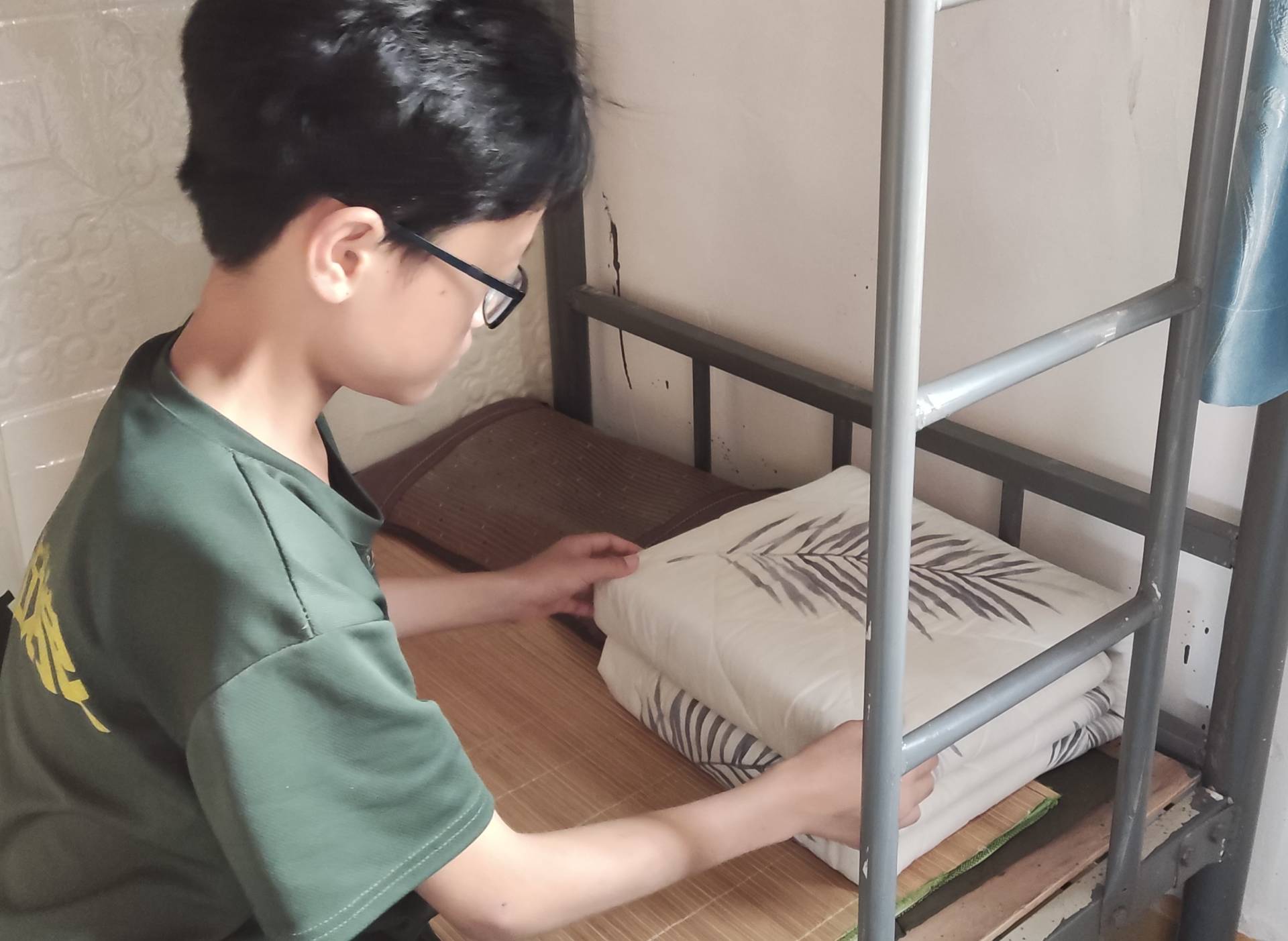 早訓(xùn)完成后,孩子們也是在教官的督促下開始了整理內(nèi)務(wù)。在整理內(nèi)務(wù)時(shí),隊(duì)員去參觀了每個(gè)寢室的整理情況,這是讓人感到驚訝的又一個(gè)方面——孩子們的內(nèi)務(wù)非常整潔,被子都疊成了“豆腐塊”狀,床上沒有任何多余的物品。此外,孩子們的衣物同樣時(shí)在這個(gè)時(shí)間由自己清洗。