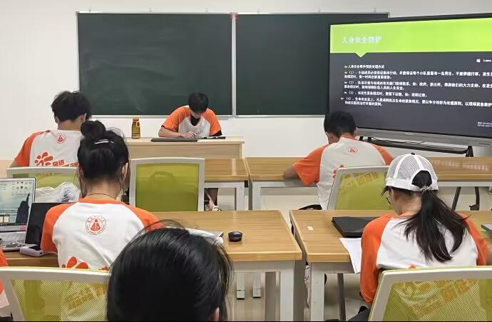 會議圍繞安全防護問題展開,一共分為兩個大部分,分別是日常安全防護,以及人身安全防護。首先,徐佳老師據日常安全防護,結合往年調研經驗著重強調注意天氣預報,出行帶好雙肩包,備好雨傘以及必需品,做好防曬,如遇雨天出行注意安全,謹防摔倒。