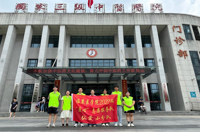 (圖為弘愛小分隊與指導老師在金寨縣中醫醫院大門處合影留念)