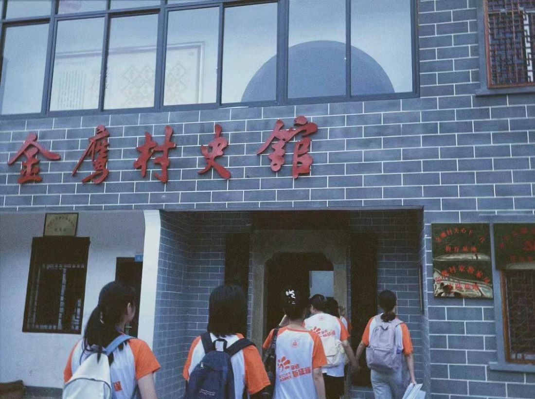參觀村史館,感受歷史溫度走進村史館,映入眼簾的就是一塊大紅匾額,上面簡單的介紹了金鷹村的歷史概況,“風雅山村,書香門第,文化遺產,發展明珠”這四個標語展現了金鷹村的發展地位。隨后隊員們在老師的帶領下參觀了村莊古居民以前的生活用具,有腰鼓、耕犁還有鐵鏟,從這些生活勞作農具中依稀可以還原當時居民的生活風貌,隊員們可以從這些文物中了解到金鷹村的過去與現在,更加加深了對田野文化的了解。