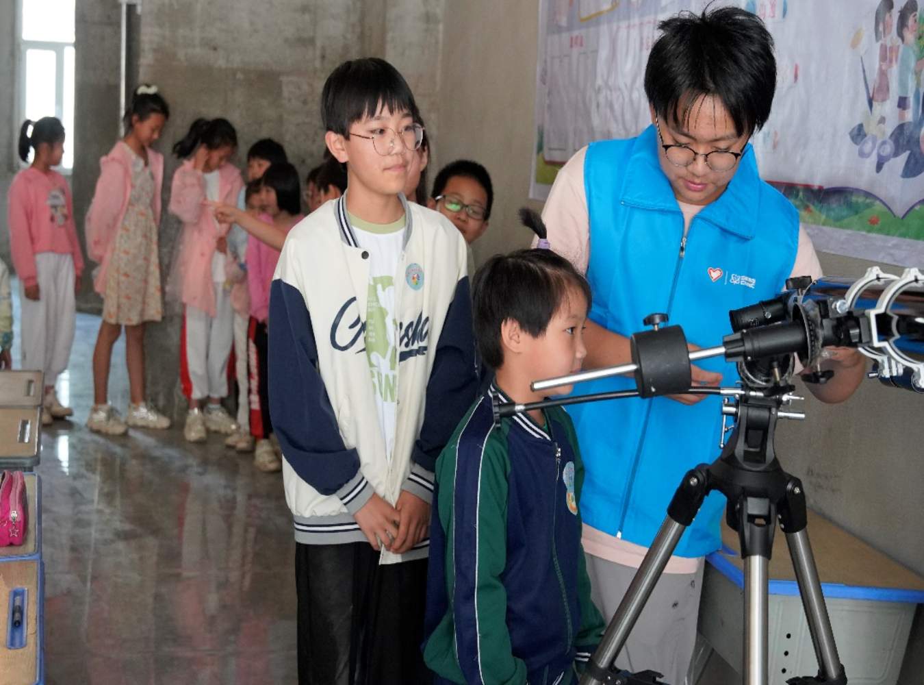 啟動儀式過后,披星戴夢團隊組織了天文科普活動。團隊成員們重點向當地的小朋友們展示天文望遠鏡,并詳細講解了天文望遠鏡的使用原理和使用方法。通過實物展示講解和上手操作的教學方式,小朋友們展現出了極大的好奇心和求知欲。在科普天文知識的同時,還讓小朋友們充滿了對星空的想象和好奇,激發了他們對天文探索的興趣,希望埋在他們心里的這顆種在未來某一天可以開花結果,煥發出蓬勃的生命力。