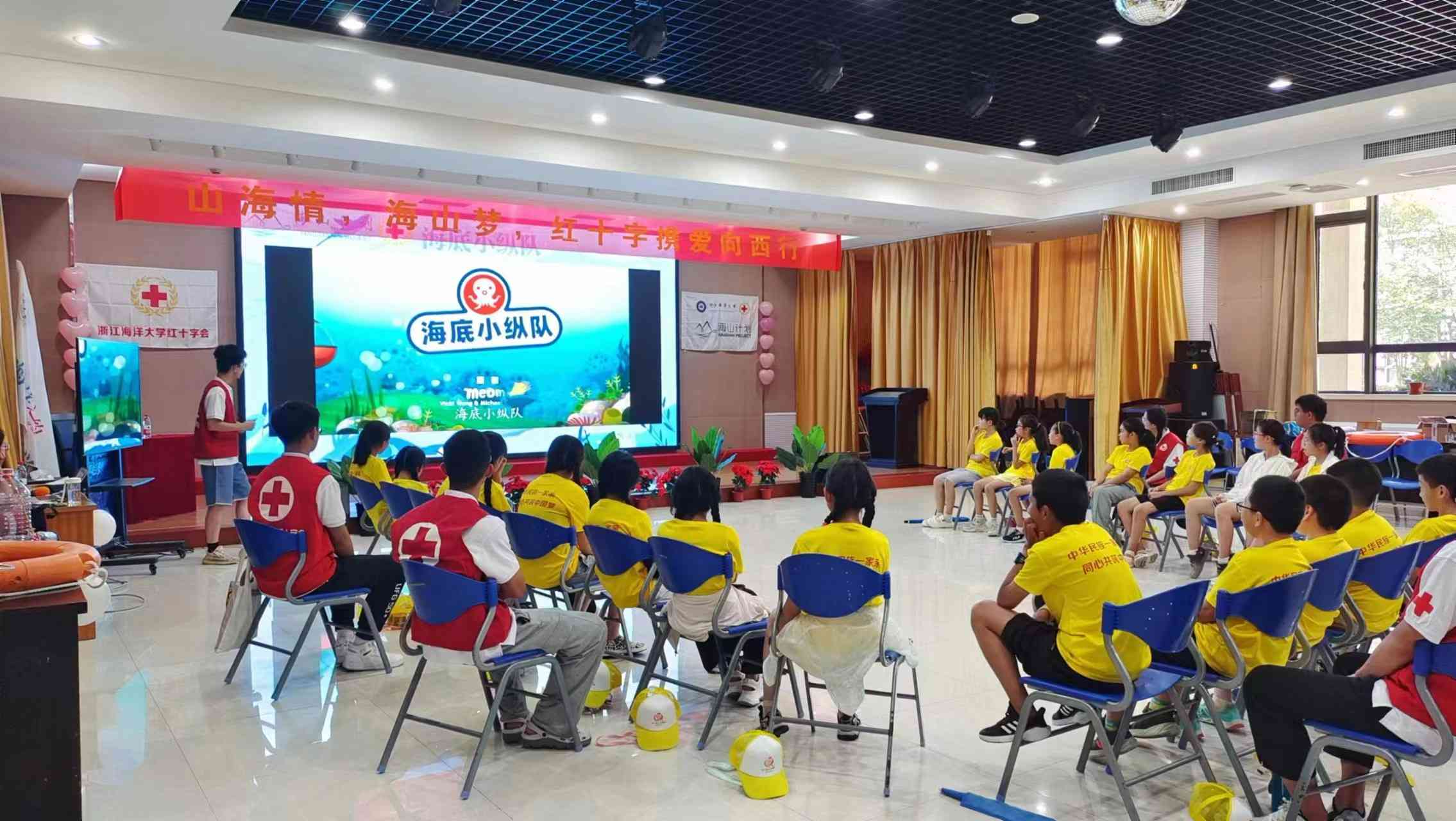 一場融入了海洋知識與紅十字元素的破冰活動也在團隊成員的組織下進行著。破冰活動以“海底小縱隊”為主題,包含自我介紹、互動小游戲等環節。孩子們積極參與到小游戲中,打破障礙,增進感情。破冰后,由浙江海洋大學紅十字會秘書長陳曉燕老師為孩子們帶來防溺水、防踩踏、氣道異物梗阻等應急知識小課堂。孩子們每人拿著急救包認真地聽陳老師授課并積極回答問題。