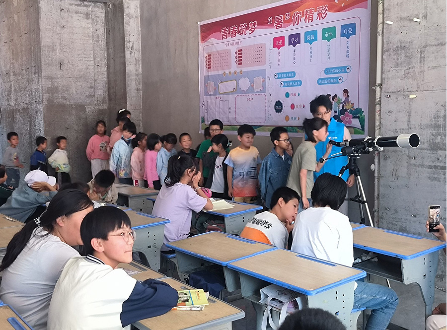中國礦業大學材料與物理學院“披星戴夢2023——星火燭遠童心,北斗引明夢想”暑期社會實踐團隊寧夏省西吉縣分隊于7月10日中午向同學們講述了天文望遠鏡的一些相關知識。天文望遠鏡是觀測天體的重要工具,沒有望遠鏡的誕生和發展,就沒有現代天文學。隨著望遠鏡在各方面性能的改進和提高,天文學也正經歷著巨大的飛躍,迅速推進著人類對宇宙的認識。