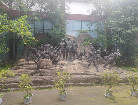 由序廳進入紀念館,在400多平方米的大型油畫太行山的背景下,朱德立馬太行組雕矗立于序廳中央,背景上以毛澤東的題詞“人民的光榮”點名紀念館主題,團隊成員進入紀念館后仰視了朱德運籌帷幄的高大形象。