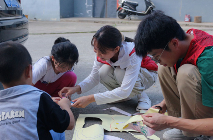 圖為實踐隊員們指導孩子們用廢舊海報按照模版制作衣服 多彩大學生網通訊員 張露露 攝