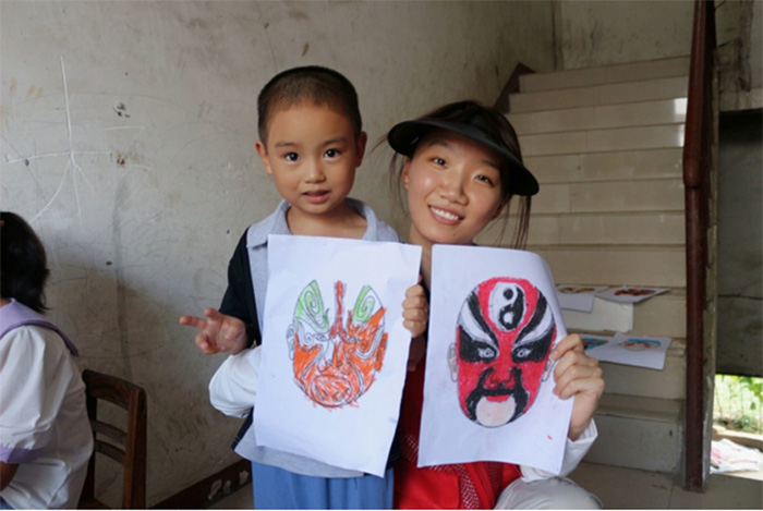 圖為實踐隊員與畫臉譜的孩子的合照 多彩大學生網通訊員 張露露 攝