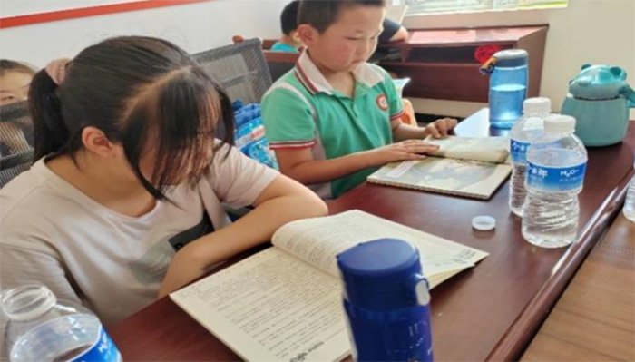 同時,為豐富課堂體驗,培養學生良好習慣,實踐團開展閱讀課和書法硬筆課。團隊成員帶領學生來到煙莊大院圖書室,引導學生選擇感興趣書籍帶回教室,并陪伴其認真閱讀。從學生興趣入手,進一步培養學生閱讀興趣。另一方面,利用一名成員講解書寫規范,多位成員一對一針對性指導學生的方式,幫助學生改正書寫錯誤,提高書寫的準確性與美觀性。
