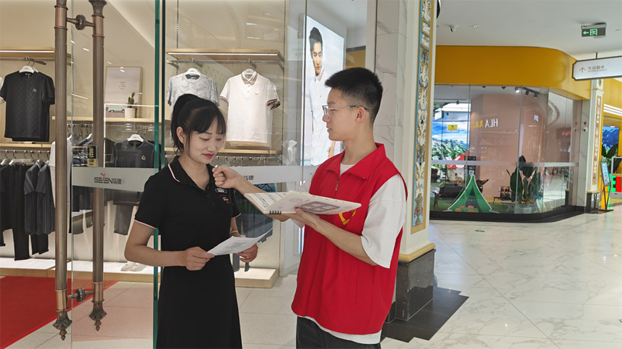 圖為我們隊員對路人進行有關“三孩政策”的宣講。多彩大學生網通訊員 盧耀華 攝