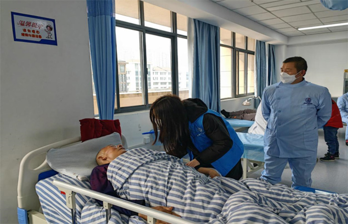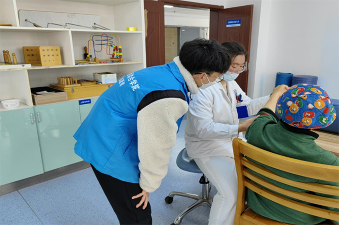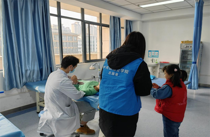 圖為隊(duì)員在康復(fù)醫(yī)師指導(dǎo)下為患者做腿部按摩 多彩大學(xué)生網(wǎng)通訊員 何雨晴 攝