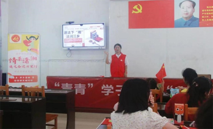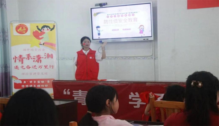 二、法治宣傳入鄉村為讓孩子們了解《中華人民共和國未成年人保護法》的重要意義,懂得如何維護自身權益,“情系瀟湘”理論普及宣講團特開展送法下鄉(湘)宣講活動。活動伊始,隊員以貼近孩子們生活的案例,講述未成年人權利受侵的情況,引出未成年人擁有受教育權、生存權、發展權等基本權利。“當同學取你綽號怎么辦?”“當高年級的學生打你時怎么辦?”隊員們利用這一系列常見問題帶領孩子們思考應該如何維護自身合法權益。在經過激烈的課堂討論后,隊員為孩子們講解解決方法,深入淺出地讓孩子們掌握利用法律武器保護自己的方法。