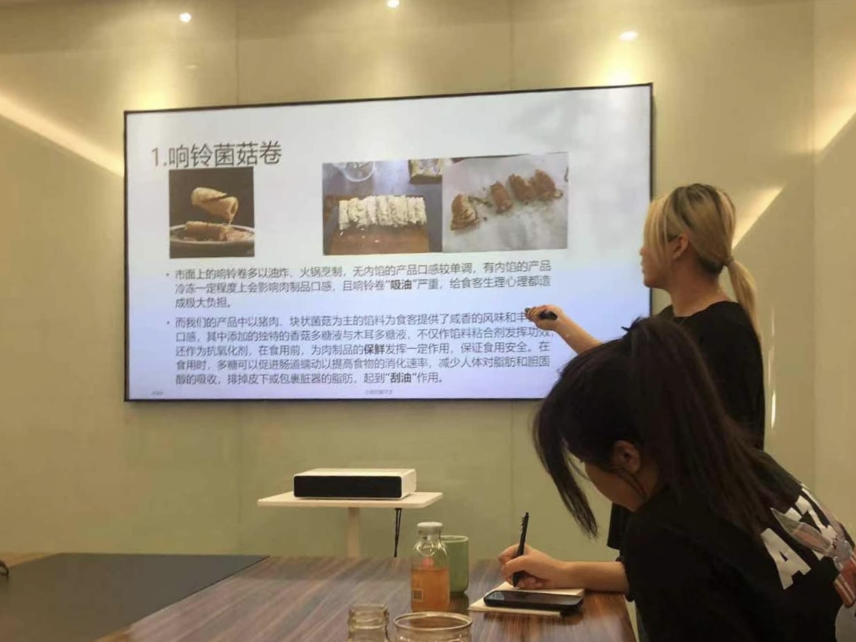 團隊派代表成員宣金潔向會議現場百興食品研發部門的代表們詳細介紹了團隊在學校實驗室自主設計的產品,并邀請企業代表們品嘗樣品并提出改進意見。而后,代表們也明確表達了希望有進一步合作的訴求和產品后續實驗的方向,為雙方在預制菜產品方面的進一步合作打下了良好的基礎。