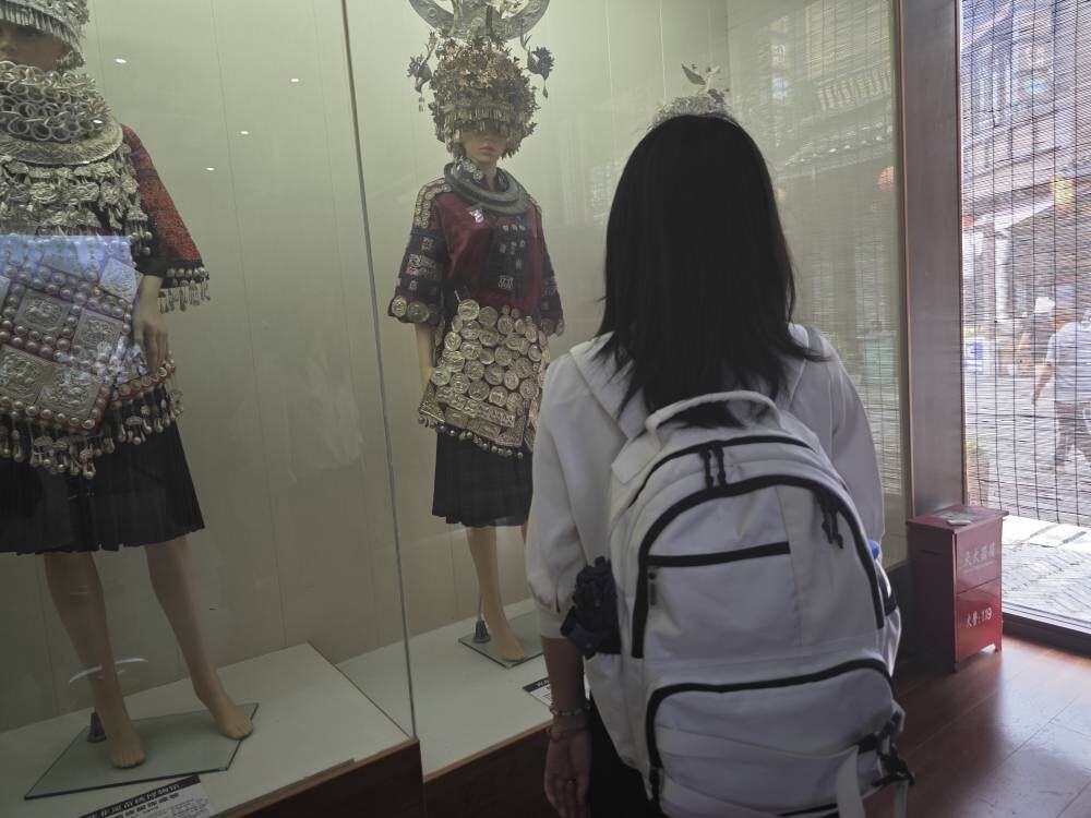 為深入了解黔東南民族文化和苗繡相關非遺文化,實踐團成員在提前預約后參觀了位于丹寨萬達小鎮(zhèn)的歐東花非遺苗繡博物館。歐東花是一位致力于苗族文化傳承發(fā)展的苗族婦女,是國家級非遺項目苗繡傳承人。她用三十年的時間走村串寨,保留了萬余件苗繡藏品。在實踐中,實踐團成員近距離欣賞了博物館內(nèi)的藏品,包括臺江施洞苗族服飾盛裝、丹寨錦雞苗族盛裝、丹寨白領苗盛裝、各類苗繡圖樣等。通過參觀精美豐富的苗繡藏品,實踐團成員們了解了在不同時期不同地域的苗族服飾特點和苗族文化歷史。博物館不僅陳列了苗繡相關藏品,也開發(fā)了苗繡相關的文創(chuàng)產(chǎn)品和旅拍服務,發(fā)展民族文化產(chǎn)業(yè),以產(chǎn)業(yè)發(fā)展收益反哺民族文化保護和博物館發(fā)展。
