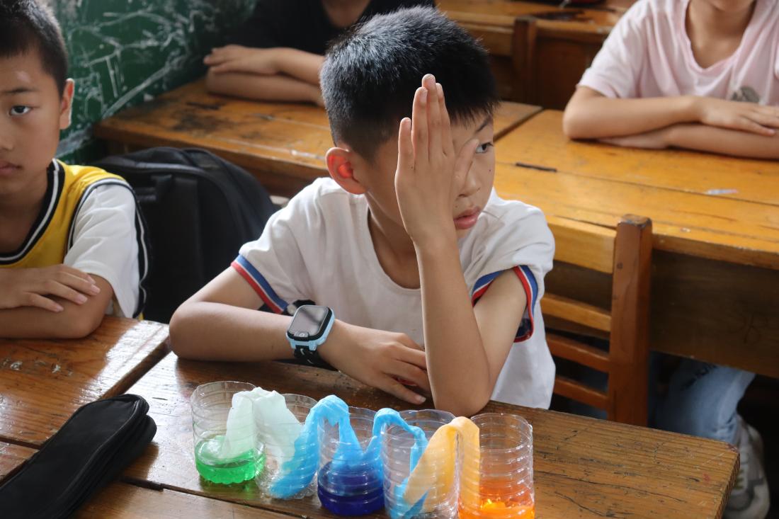 在妙趣橫生的金色課堂上,實踐團的各位老師充分發揮個人優勢和專業特色,開展了一系列寓教于樂,干貨滿滿的課程,讓孩子們在歡樂興奮的氣氛中探索世界的奧秘。擅長科學實驗的薛軻奕同學,為不同年級的孩子們準備了“黃金噴泉”“彩虹橋”“傳聲筒”等趣味小實驗,向孩子們介紹了毛細現象、變色原理、化學反應、物理密度和聲的傳播特點等一系列物理、化學知識;交通運輸專業的吳舒穎同學結合列車知識,和孩子們一起動手做出了“金鉤編組站”,在歡樂的氛圍中,孩子們感受到了我國交通領域的蓬勃發展;作為中年級教導主任的李嘉賢同學,在各個班級開展了生動活潑的暑期防溺水主題教育,孩子們紛紛表示要遠離水庫池塘、對自己的生命負責。