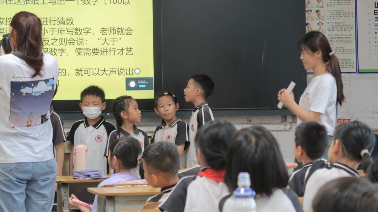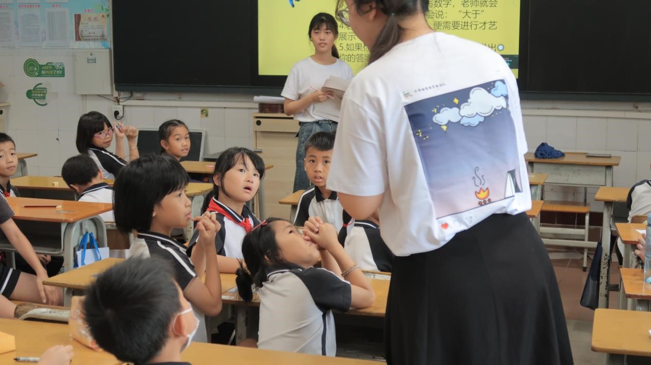 最后一個游戲是游戲炸彈。君怡老師先在紙上寫出了一個數字,讓小朋友們避開這個炸彈數字,當范圍越來越小時,大家越發緊張了。“82!”一位小朋友猜測,“呀!踩到炸彈了!”君怡老師向大家揭曉了炸彈數字。幾輪以后,小朋友們玩的不亦樂乎,游戲環節也接近尾聲。最后,君怡老師請幾位踩到數字炸彈的小朋友上臺展示才藝。映吟老師也將第二輪的結果揭曉,對幾位寫出正確答案的小朋友進行了獎勵。