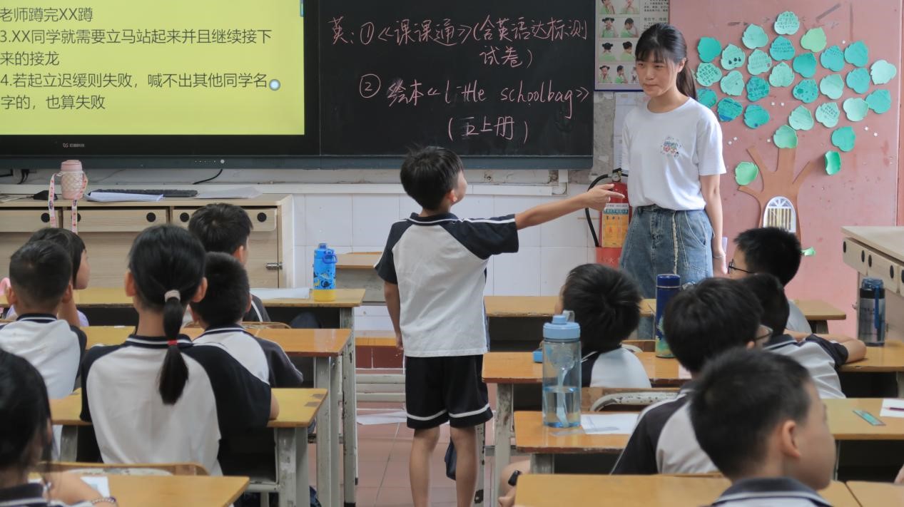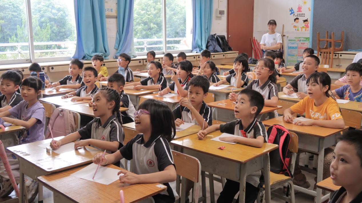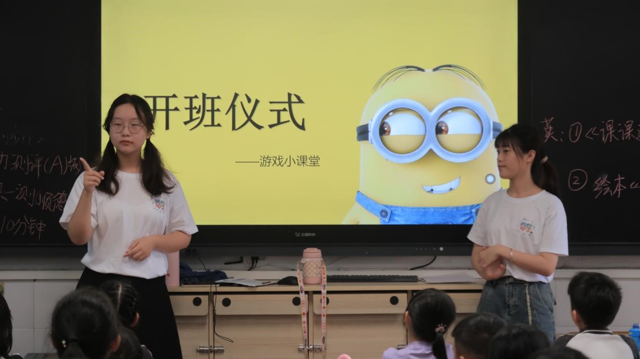 一班開班儀式2023年7月17日,開營儀式結束以后,在華南師范大學物理學院團委學生會服務隊教務組成員賈君怡和陳映吟的帶領下,成長營一班的小朋友們一起來到教室里進行開班儀式。