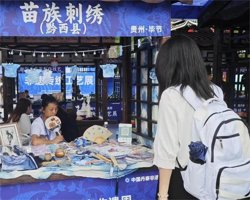 圖二 團(tuán)隊(duì)成員參觀工藝展中的黔西縣苗族刺繡