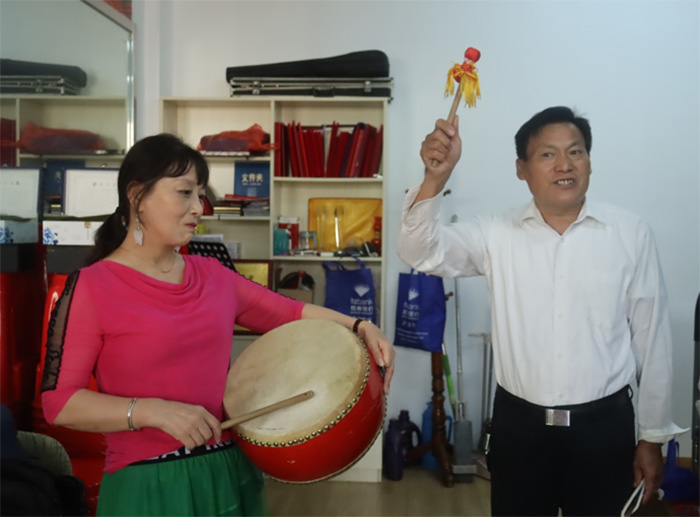 在采訪過程中,徐團長與朱會長談到了方言與非遺文化的關聯性,還一起表演了廬劇門歌《大美廬江我的家》的片段。銅鑼聲一響,便令人眼前一亮,婉轉的女生與低沉的男聲交相輝映,獨特的方言唱腔與富有節奏感的敲鼓聲讓我們仿若來到了表演的現場,即使二位沒有穿上正式的戲服,卻也依舊能在他們清澈的眼神中看到他們對廬劇門歌的信念感,對家鄉方言與非遺文化的熱愛。
