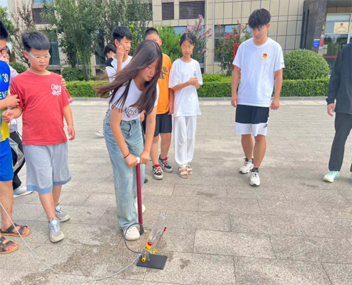 在室內對水火箭起飛原理進行系統的講解后,我們還在戶外進行了水火箭的制作和發射。想通過這一活動,激發同學們對于航空航天的興趣。在志愿者的幫助下,同學們親手放飛水火箭,將理論知識與動手實踐相結合,希望同學們更能理解這些科學小實驗中的原理和奧秘。