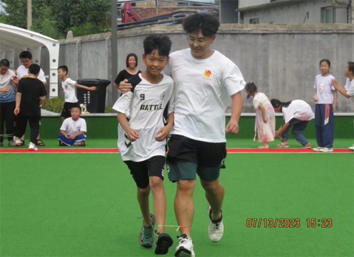 圖為素質拓展課上志愿者與同學一起完成兩人三足競速 拍攝:王琛