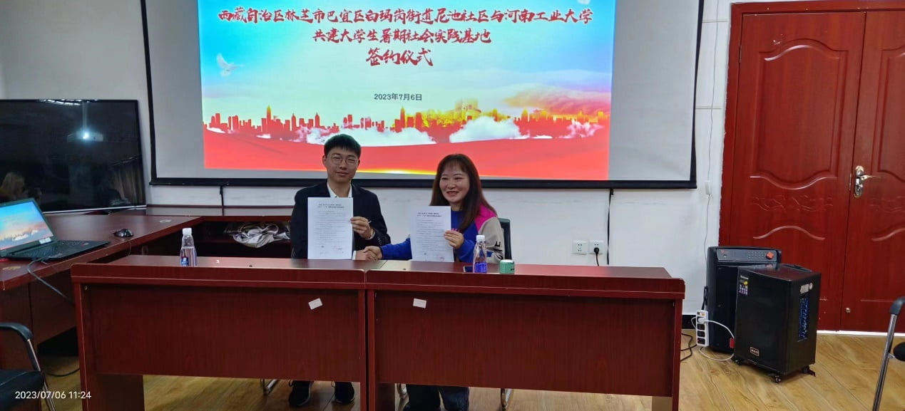 本網(wǎng)7月6日電(通訊員:秦夢杰 符策吉)2023年7月6日,河南工業(yè)大學(xué)與西藏自治區(qū)林芝市巴宜區(qū)白馬崗村街道尼池社區(qū)達(dá)成社會實踐基地合作的簽約儀式在巴宜區(qū)白瑪崗街道辦事處尼池社區(qū)退役軍人服務(wù)站舉行。尼池社區(qū)駐村第一書記譚利、社區(qū)工作人員,河南工業(yè)大學(xué)“鄭在林芝 愛在工布”赴西藏社會實踐團隊的全體成員出席簽約儀式。