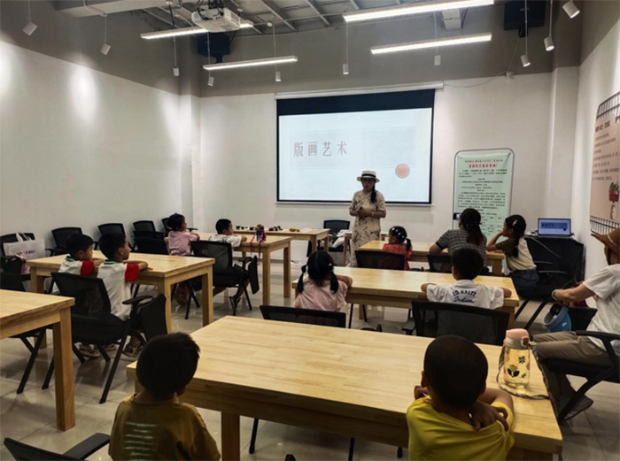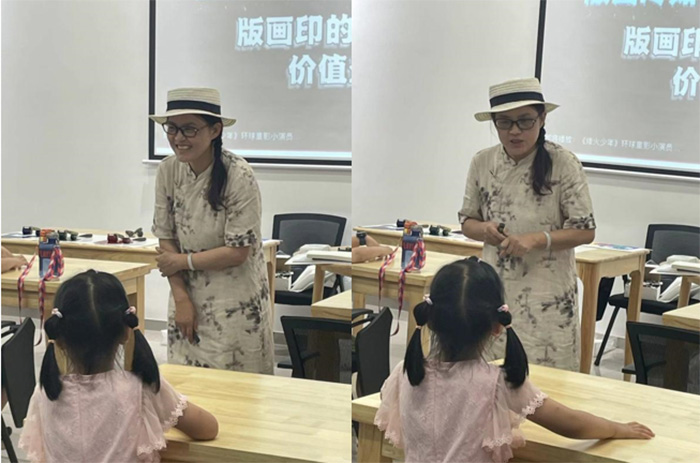 圖為主講老師唐麗為孩子們講解版畫相關知識。(多彩大學生網通訊員 米雅煊 攝)
