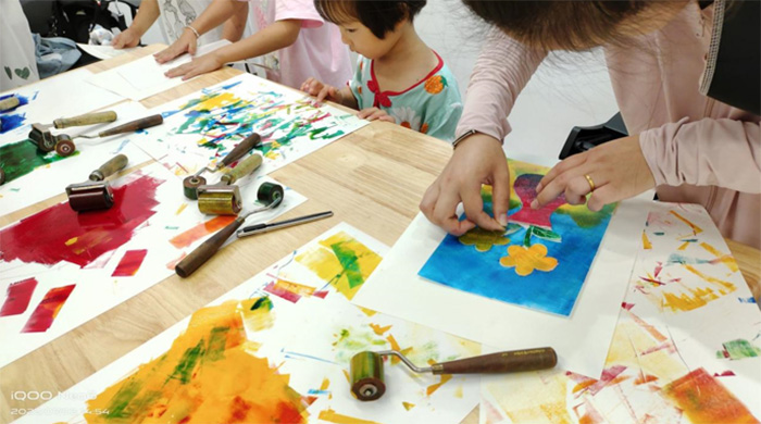 圖為孩子與家長共同完成版畫中的制版步驟(多彩大學生網通訊員 米雅煊 攝)