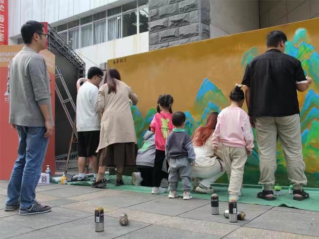 福州大學至誠學院2022級產品設計01班團支部的同學們于2023年10月21日在創意樓前以長卷共繪《千里江山圖》的形式
