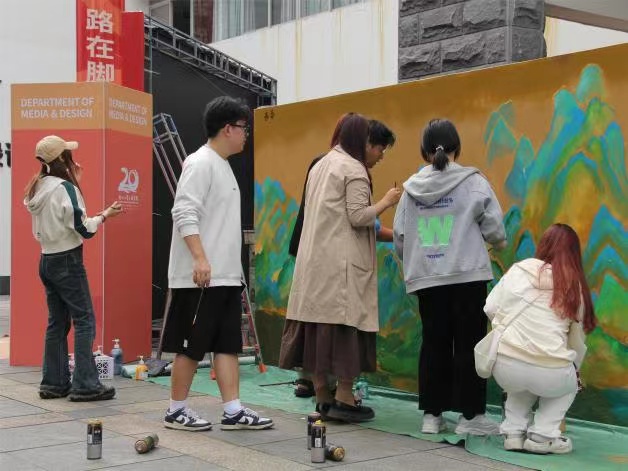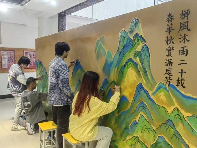 福州大學至誠學院2022級產品設計01班團支部的同學們在創意樓前與校友們共同完成《千里江山圖》最后一抹青綠,為至誠華誕獻上祝福。