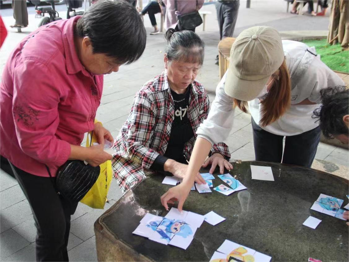 志愿者們有序引導大小朋友們,進行亞運會吉祥物趣味拼圖活動,并